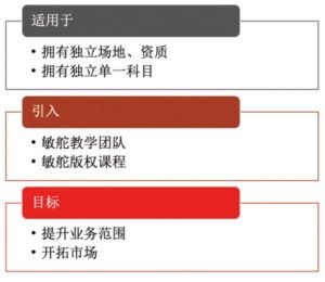 此类型合作方式适用于已经拥有独立场地,并有一定的教学资源(学生、教材、部分教学团队等)的培训机构。通过引进敏舵的教学团队和版权课程,对原有课程内容进行升级的同时,拓展营业范围,完善科目品类。借助敏舵线上、线下课程、活动、师生管理平台,对学员进行更及时有效的信息了解及意见反馈。无需任何的前期投入,就能拥有全面的教学资源、专业的教师团队和版权课程做全方位的支持。不需要任何的加盟和投资,只需要提供学员和场地(线上不需要),就可以全方位扩展您目前相对单一的授课项目,减少学生奔波于各科培训补习机构的时间成本,消除因种类不全而流失学员的可能性。